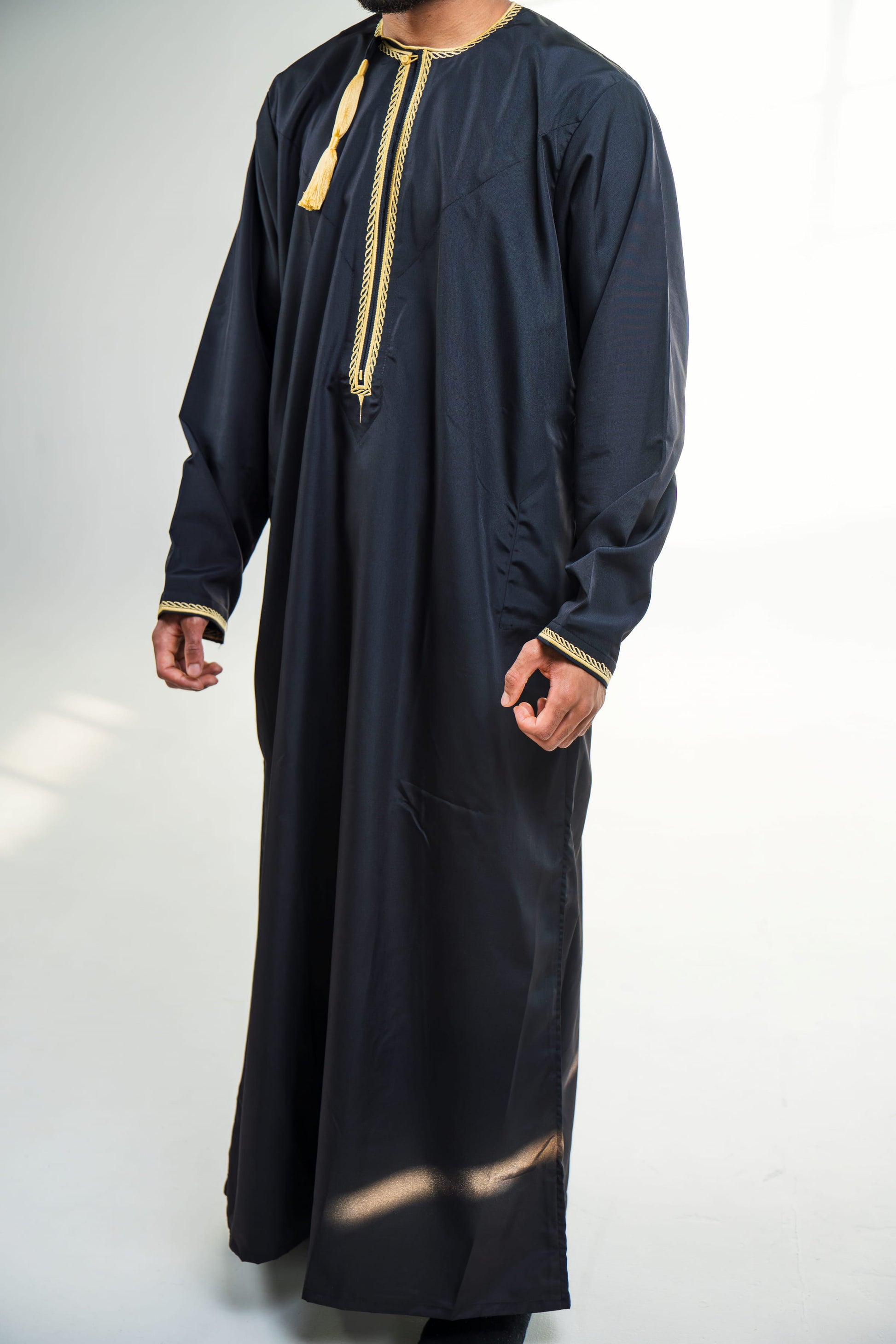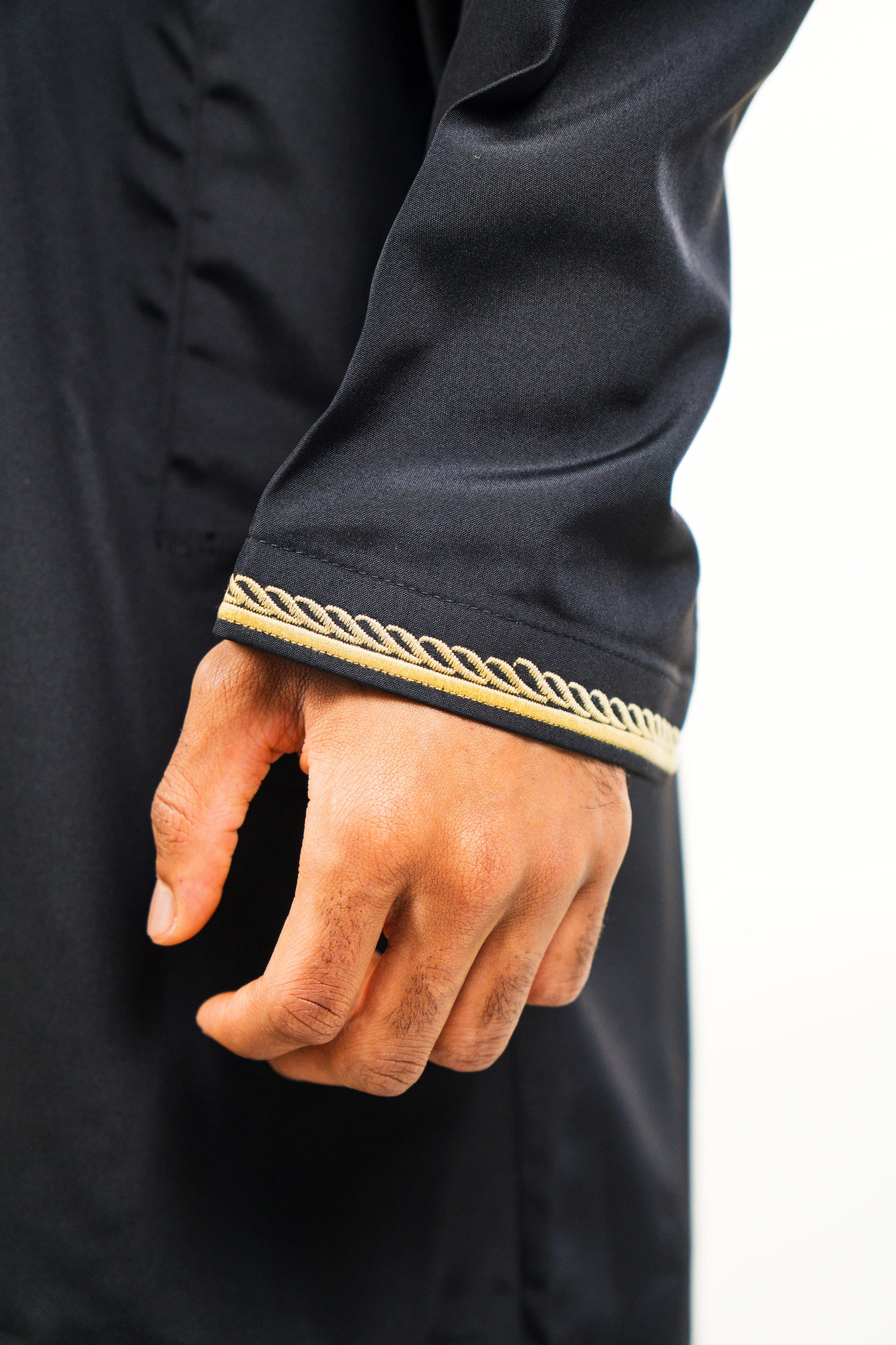 The Black Thobe features a deep black finish paired with gold embroidery for a bold yet restrained look. Designed with simplicity in mind, it offers a relaxed fit and timeless appeal without unnecessary detailing.