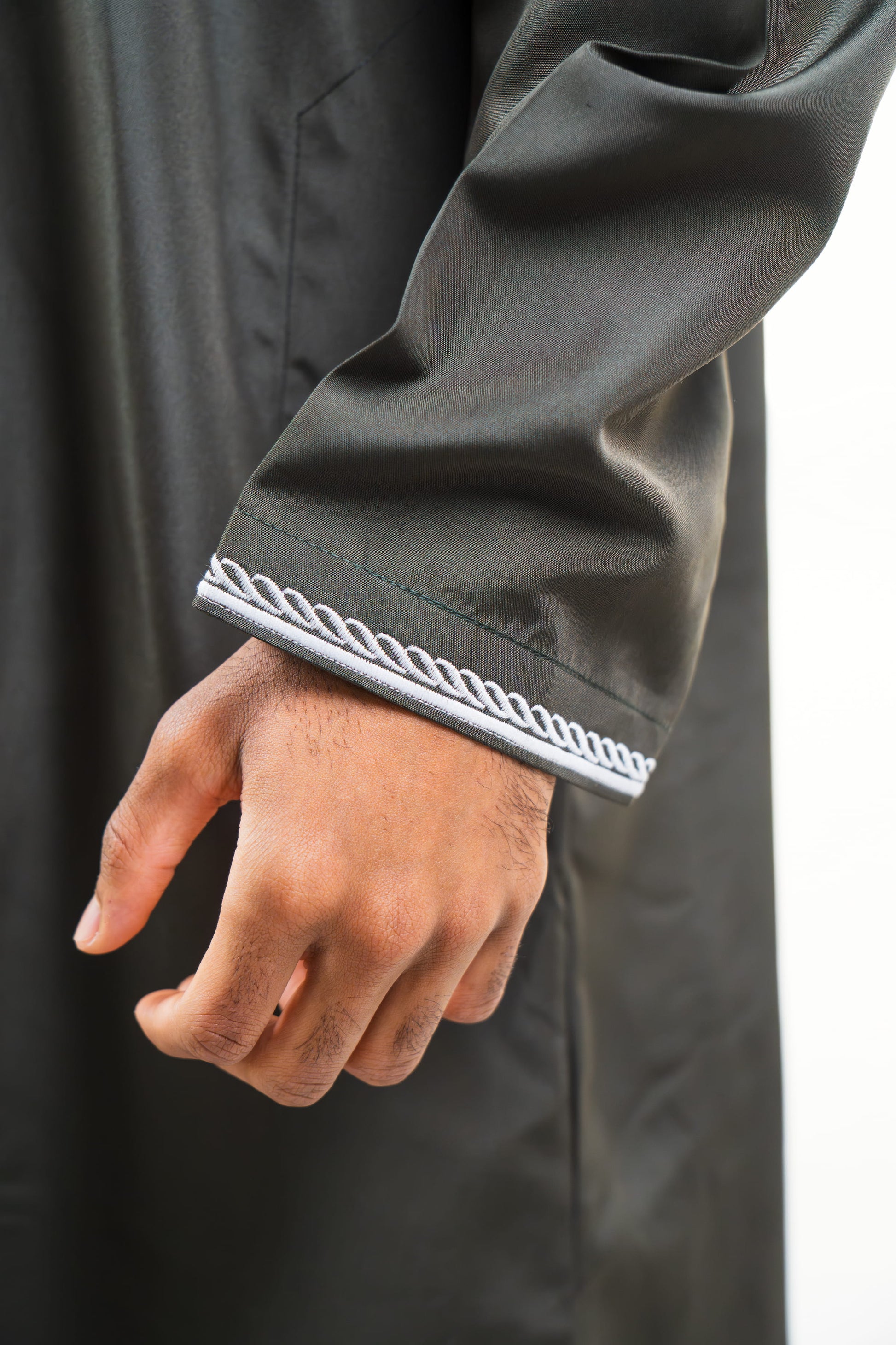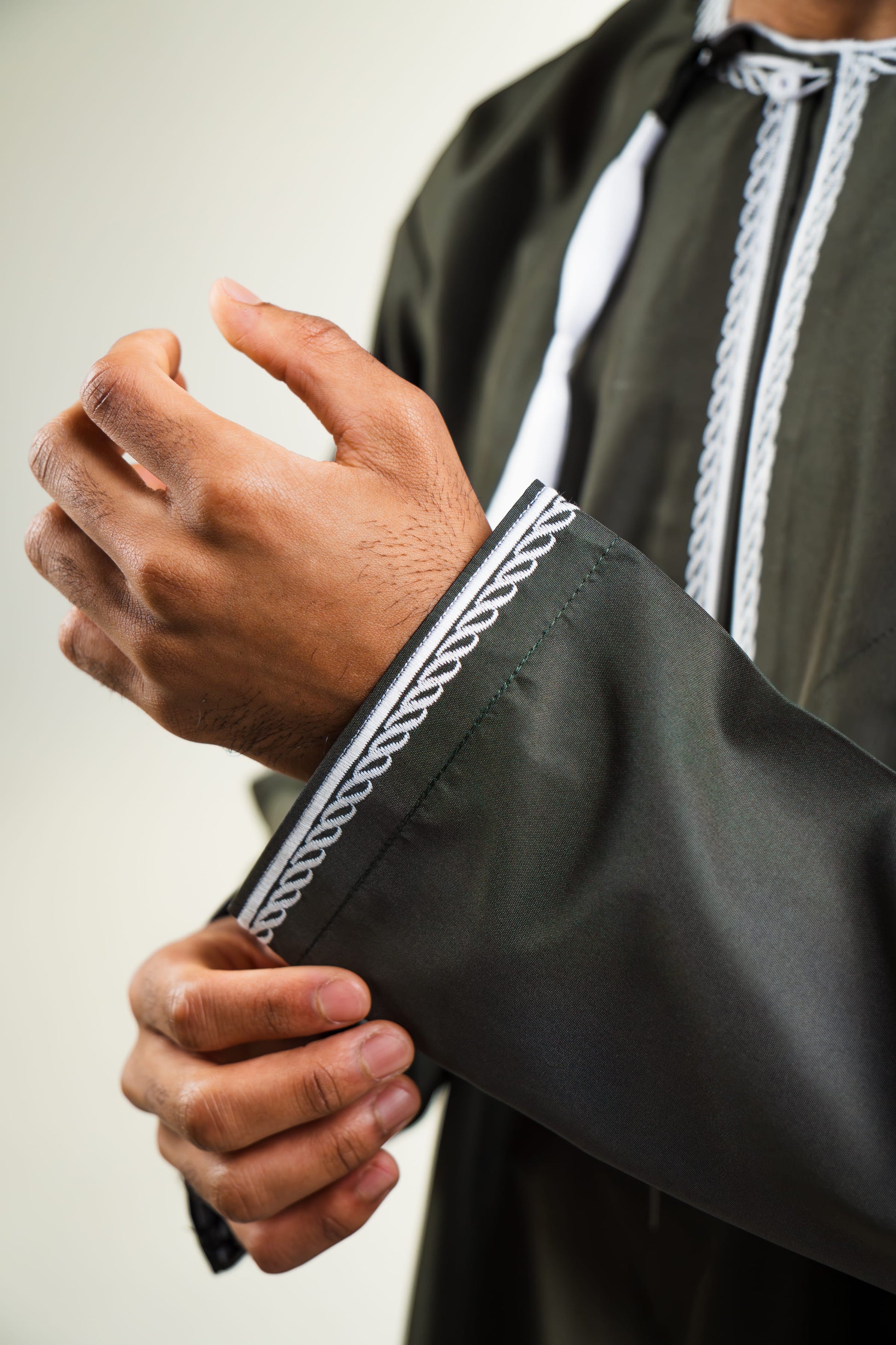 The Forest Green Thobe comes in a rich, muted green shade with contrasting white embroidery. Its understated finish and relaxed fit make it ideal for daily wear while maintaining a grounded, refined look.